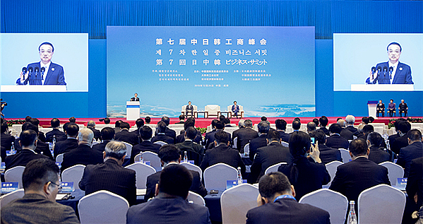 12月24日,由中国贸促会、韩国大韩商工会议所、日本经济团体联合会共同主办的第七届中日韩工商峰会在成都隆重举行,中日韩三国领导人出席会议。此次峰会以“科技引领合作,创新促进发展”和“绿色改变生活,健康和谐…